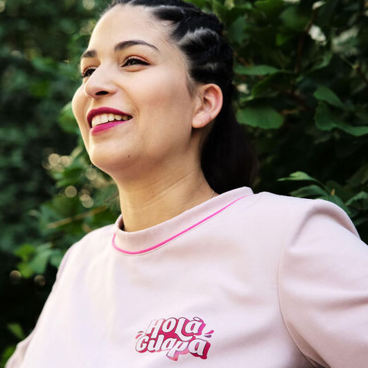 Sweat d'allaitement bois de rose avec passepoil fuchsia et sérigraphie Holà Guapa.