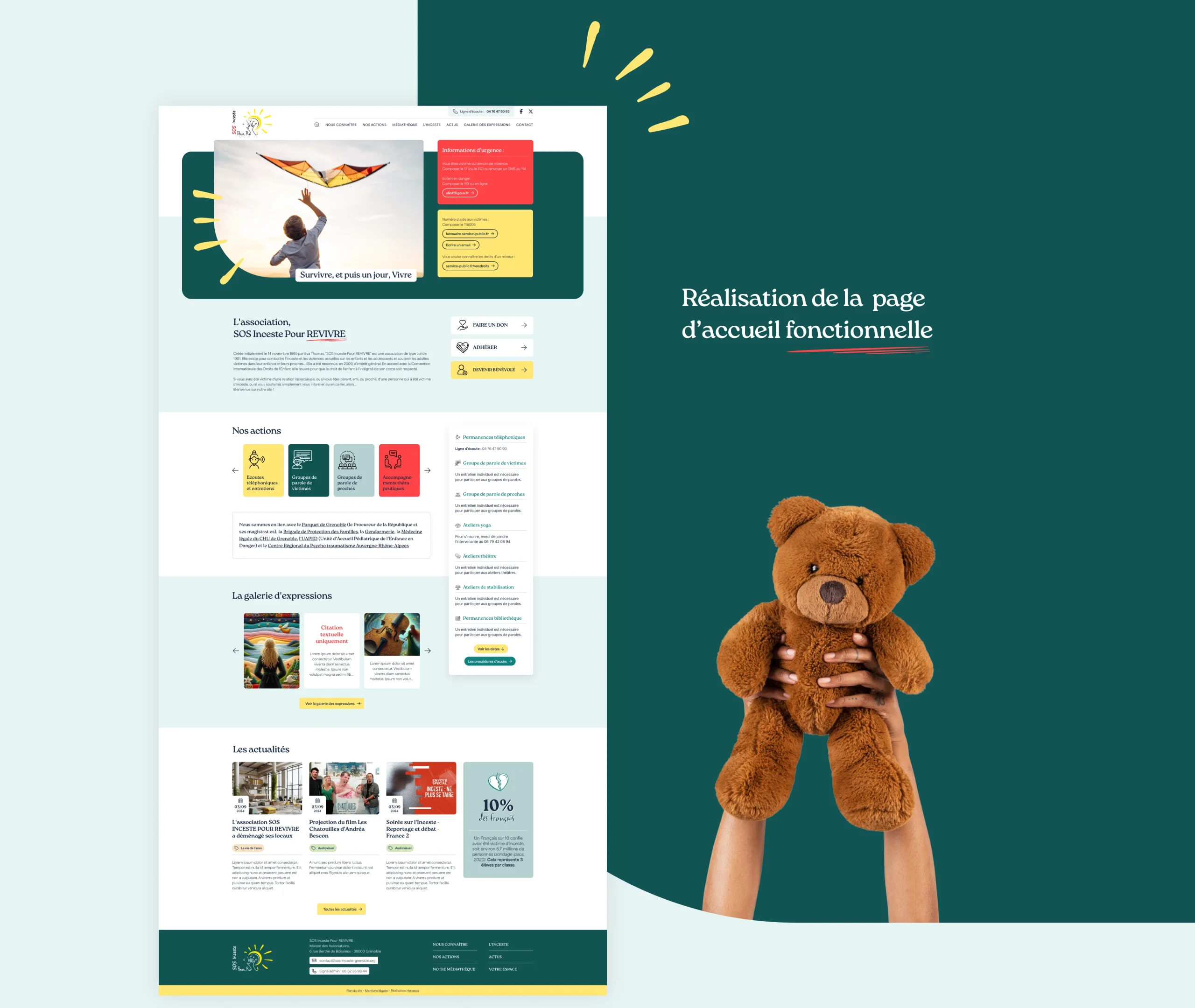 L’association “SOS Inceste pour revivre” m’a confié la refonte de son site internet, avec un double objectif : mieux informer le grand public et faciliter le travail des bénévoles (écoutantes, animatrices d’ateliers). Un projet délicat, qui demandait de trouver le bon équilibre : dire les choses clairement, sans heurter, et illustrer chaque propos avec justesse.